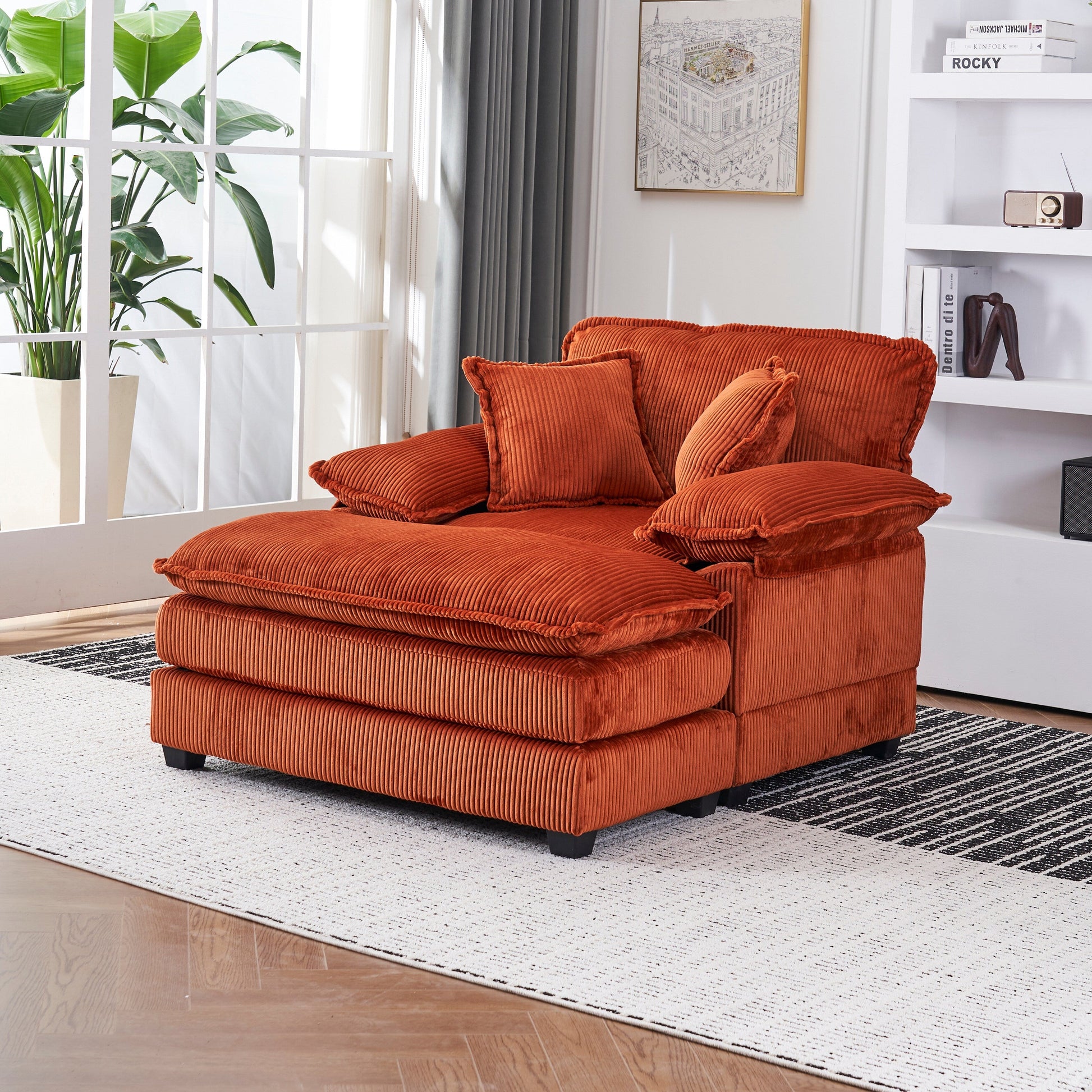 Orange 59.3 Corduroy Single Deep Seat Sofa with 2 Toss Pillows and Ottoman for Living Room