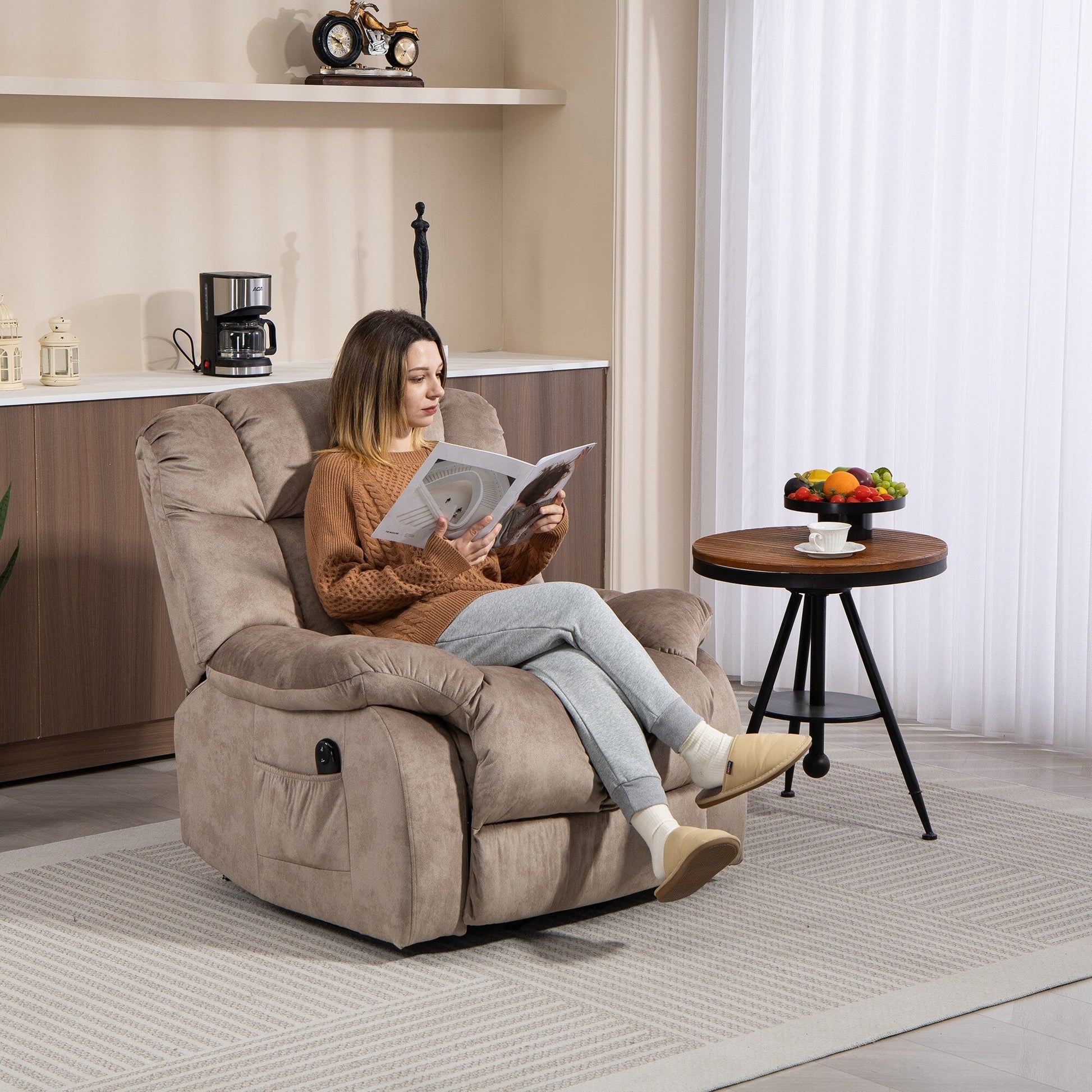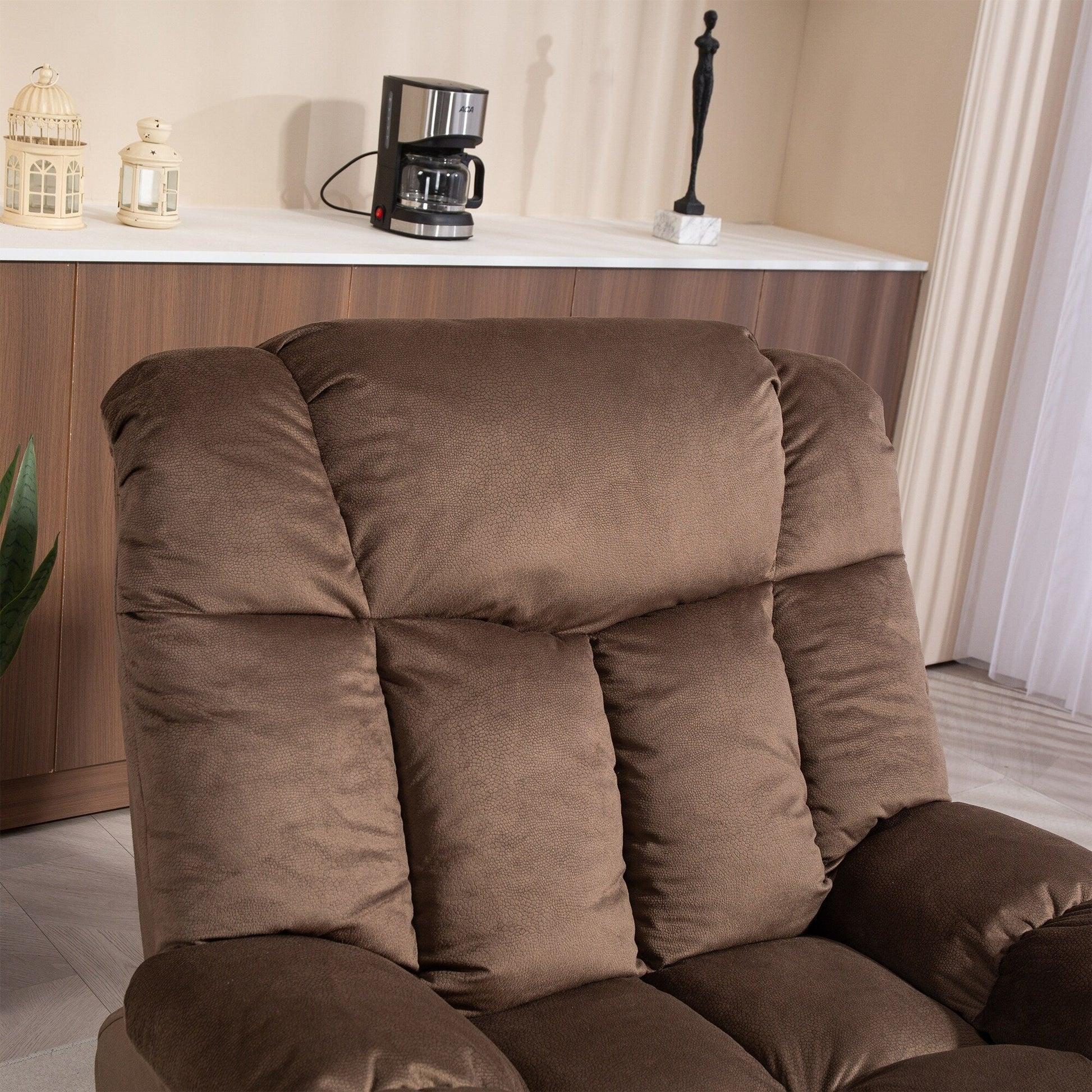 �em>Safety and Stability� Designed with a durable wood and iron frame, this recliner supports up to 300 lbs, ensuring stability and safety for all users.