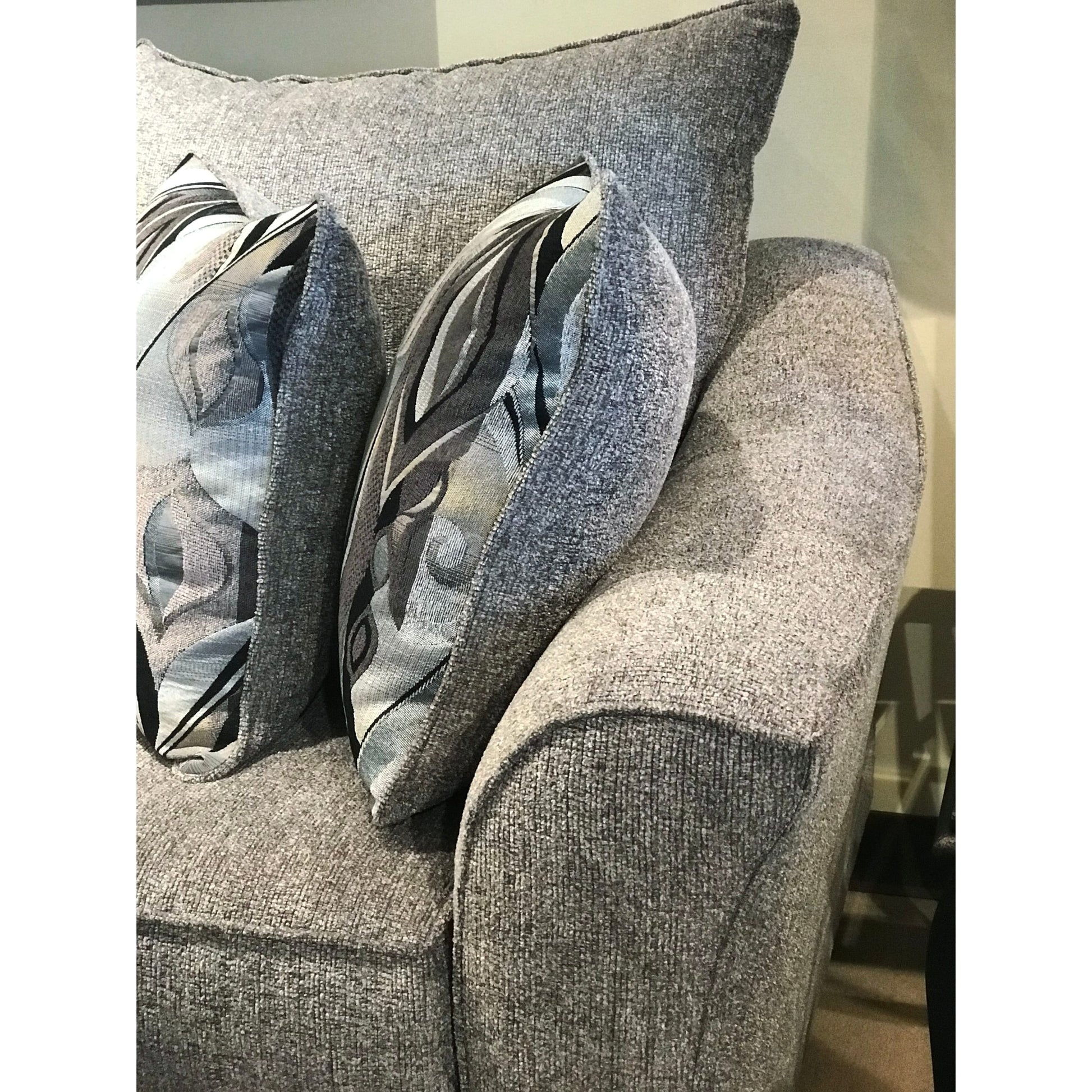• Textured fabric upholstery with overstuffed back cushions to provide comfort, throw pillows included.
