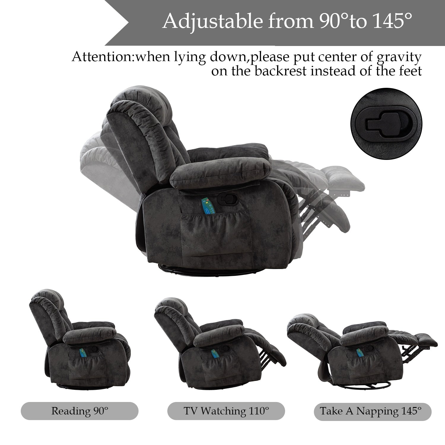 Relax and rejuvenate your body with our Soft Fabric Power Massage Chair Recliner with Manual Rocker. This luxurious breathable recliner features a four-point massage system (back, lumbar, thigh, leg) with 5 adjustable modes and 2 intensity options, providing you with a full-body massage in the comfort of your own home. The massage and heating functions can be easily controlled using a single multi-function remote, and the timer function allows you to set the massaging time for 15/30/60 minutes. The chair also rocks back and forth when the footrest is closed, making it the perfect spot for mothers and babies to rest together. With its high-density foam and laminated veneer lumber (LVL) system, this recliner offers maximum comfort and stability, making it ideal for your living room, bedroom, or home theater room.