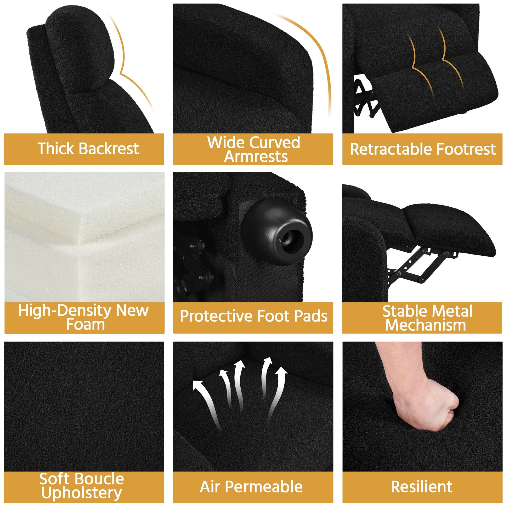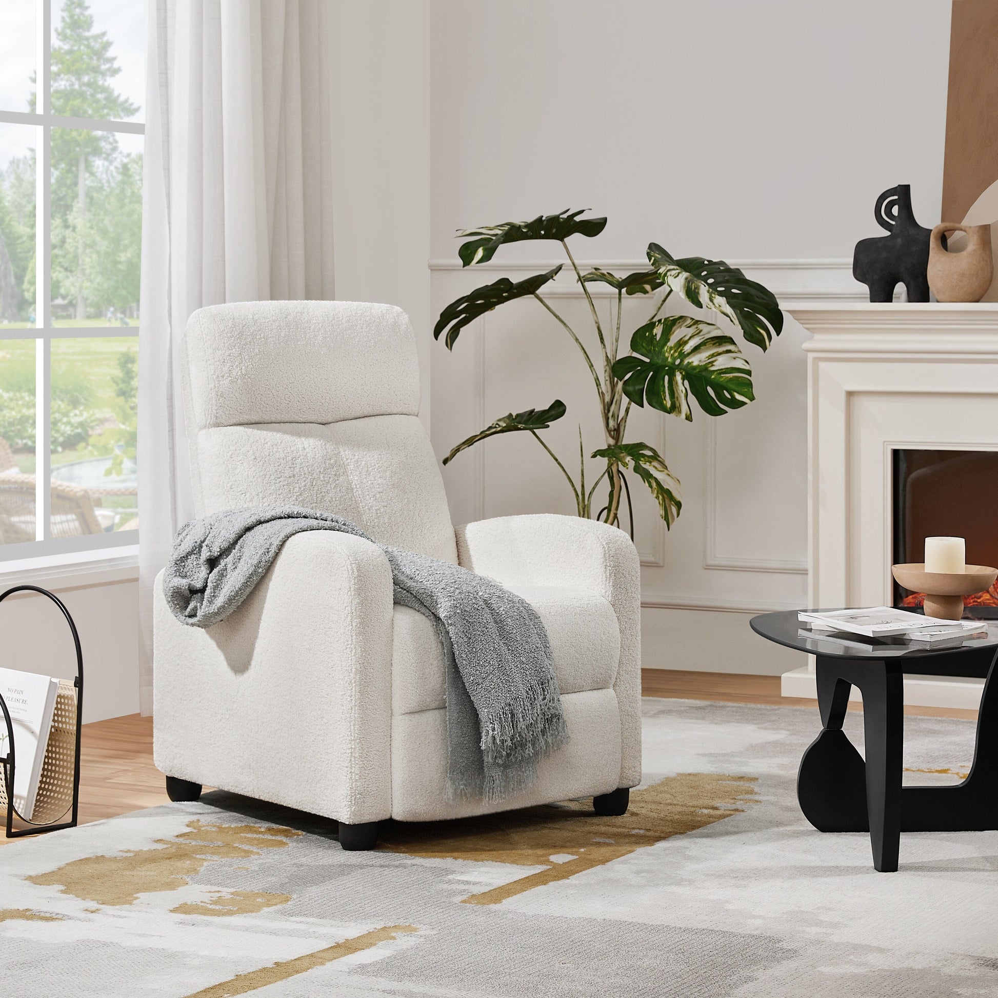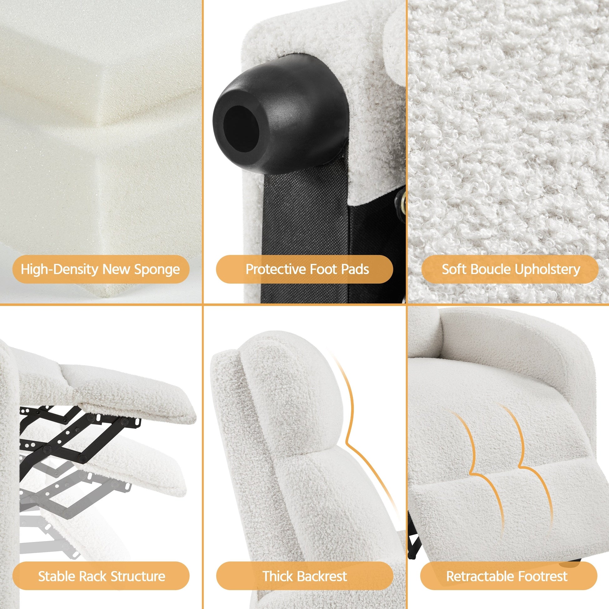 An ideal ?combination of comfort and style - this boucle recliner is crafted with a ?sturdy engineered wood frame, soft and warm boucle upholstery, plush ?fiber fills, and resilient pocket springs, easily supporting up to 265 ?lb. Adjust the backrest and footrest to your preference - sit upright, ?elevate your legs, or lay flat. A gentle push on the backrest ?effortlessly lifts the footrest to any angle between 0 and 90 degrees. ?Sink into the marshmallow-like softness of the seat and backrest after a ?long day. This recliner is here to pamper you and provide the ultimate ?seating experience. Whether you place it in your living room, bedroom, ?home theater, office, or any other space, this reclining sofa is a ?fantastic addition that will elevate your space to new levels of comfort ?and sophistication. ?